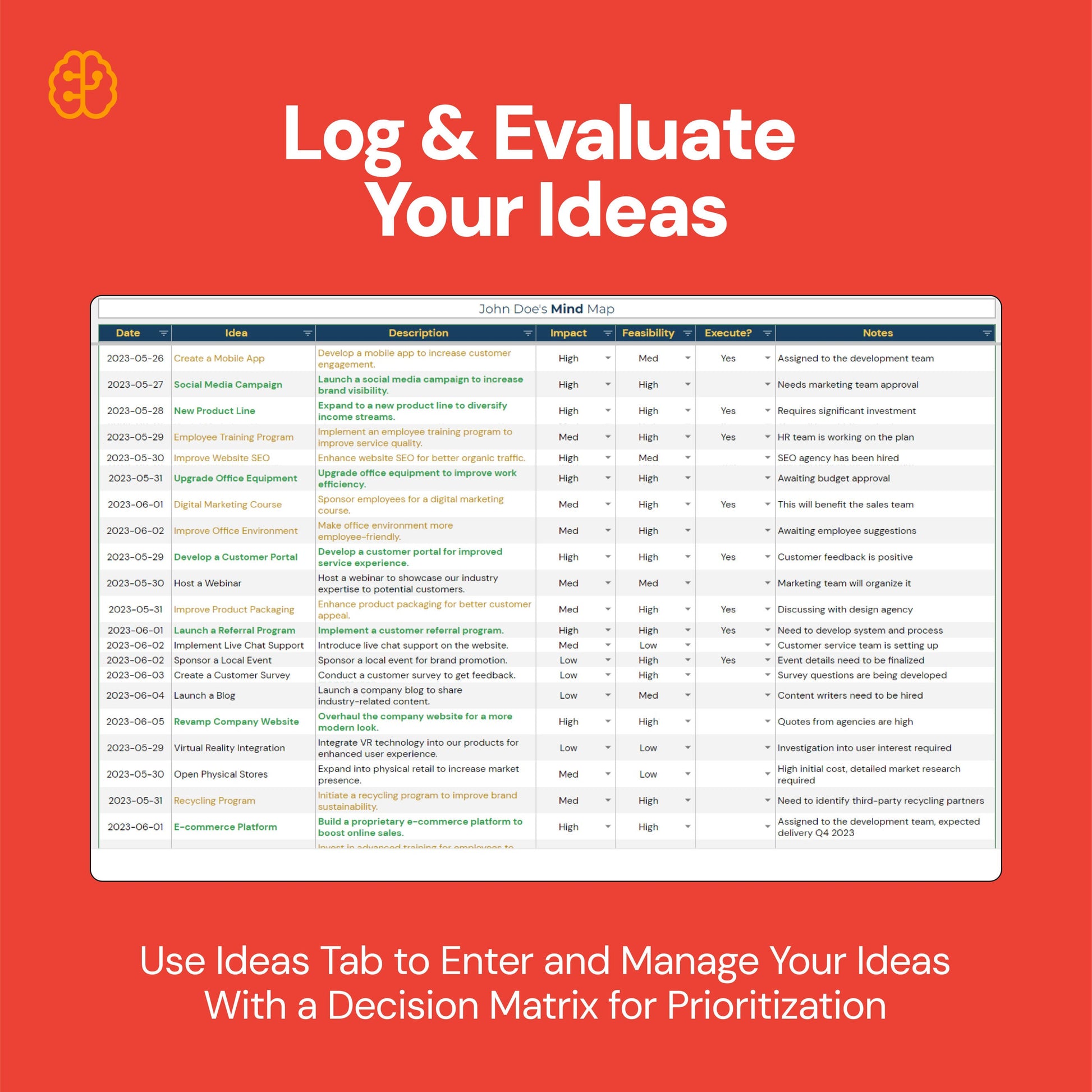 - Personalized Ideas Log: Catalog and manage brainstormed ideas with date and description, ensuring a secure and personalized space for users.