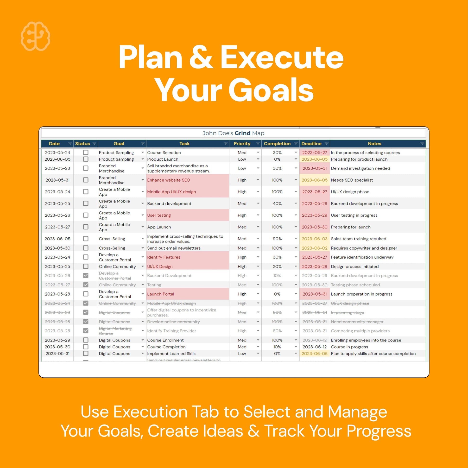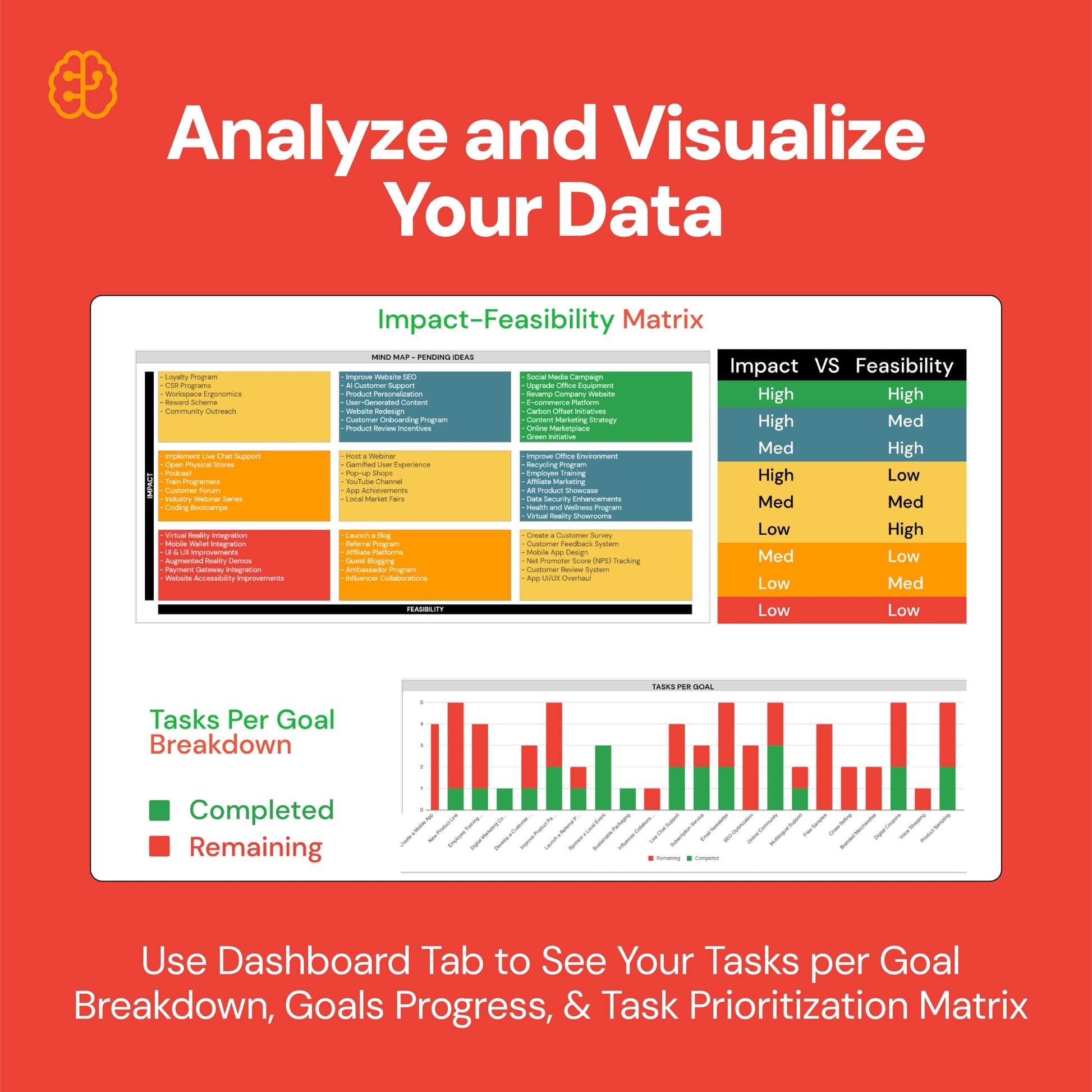 - Visual Progress Tracker: Offers color-coded progress bars and mind maps to visualize and evaluate the impact, feasibility, and completion status of tasks.